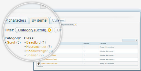 In the Inventory page for example, you can combine item categories, classes, equip slots and augmentation types to refine your search. You can instantly find all scrolls for your Necro or all augmentations that fit in a head slot of type 7.